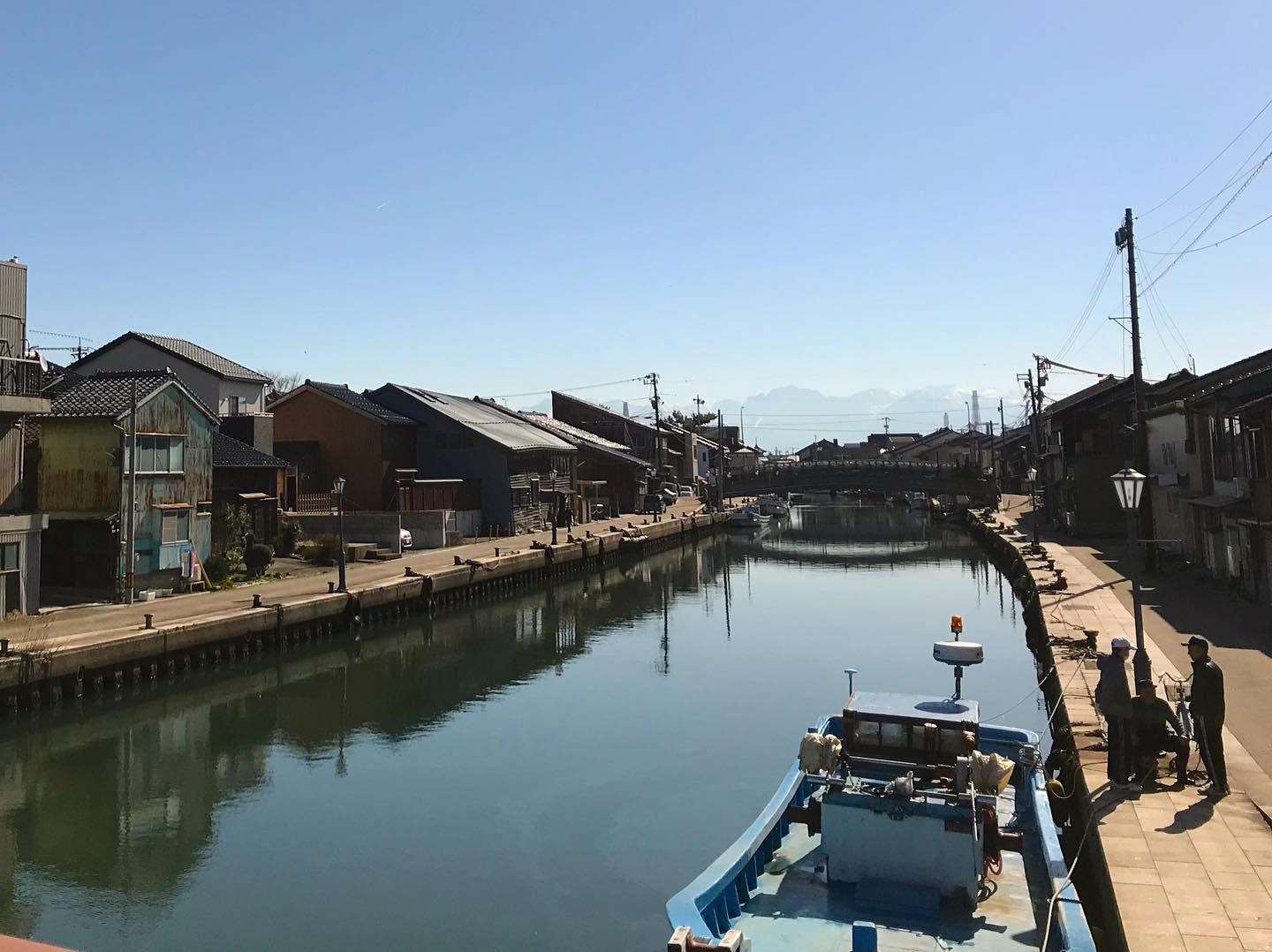 内川に架かる橋の上から遠くを眺めると、雄大な立山連峰が広がり、多くの人々を魅了しています。